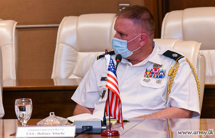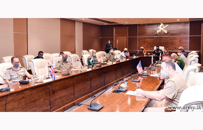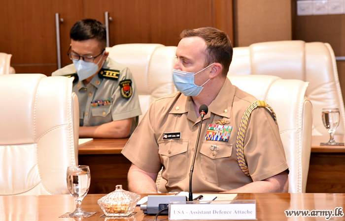 Colombo-based Defence Advisors/Attaches of Australia, Bangladesh, China, India, Japan, Pakistan, Russia, United States and the United Kingdom this afternoon (23) called on Lieutenant General Shavendra Silva, Chief of Defence Staff, Commander of the Army and Head of the National Operations Centre for Prevention of COVID-19 Outbreak (NOCPCO) at the Army Headquarters with a view to keeping them updated on current preventive efforts against COVID-19 and the status quo as regards its transmission and emergence of clusters, etc.