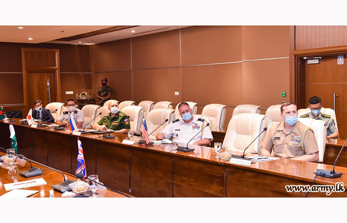 Group Captain Sean Unwin, Defence Advisor in High Commission of Australia, Commodore Syed Maksumul Hakim, Defence Advisor in High Commission of Bangladesh, Senior Colonel Wan Dong, Chinese Embassy Defence Attaché, Captain Vikas Sood, Defence Advisor for High Commission of India, Captain Gaku Fukaura, Defence/Security attaché of Japanese Embassy, Colonel Muhammaed Safdar Khan, Pakistan High Commission's Defence Advisor, Colonel Denis I. Shokda, Russian Federation Embassy's Military, Air & Naval Attaché, Lieutenant Colonel Travis Ray Cox, Defence and Army Attaché at the Embassy of the United States and Colonel David Alfred Ashman, Defence Advisor for British High Commission, together with the Assistant Defence and Army attaché of the United States Embassy in Sri Lanka, were among those diplomats who took part in the discussion. |