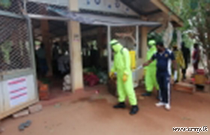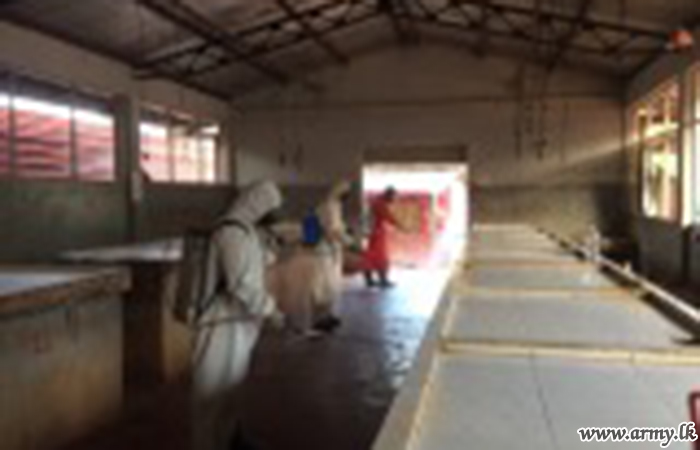 Mullattivu-based 68 Division troops of the Security Force Headquarters - Mullaittivu (SFHQ-MLT) on the directions of Major General Jagath Rathnayake, Commander, Security Forces - MLT and Major General Upali Rajapaksha, General Officer Commanding, 68 Division on Friday (30) carried out a disinfection and sterilization campaign in and around the public market place and fish market in order to mitigate risks of contamination during the spread of COVID - 19 threat.