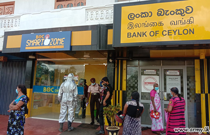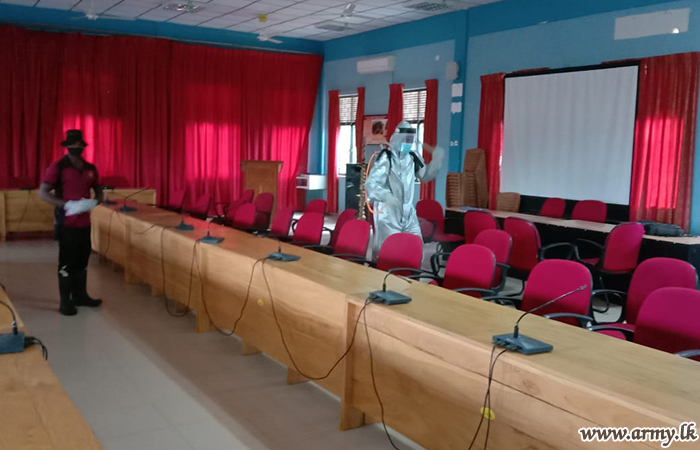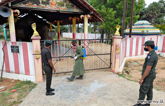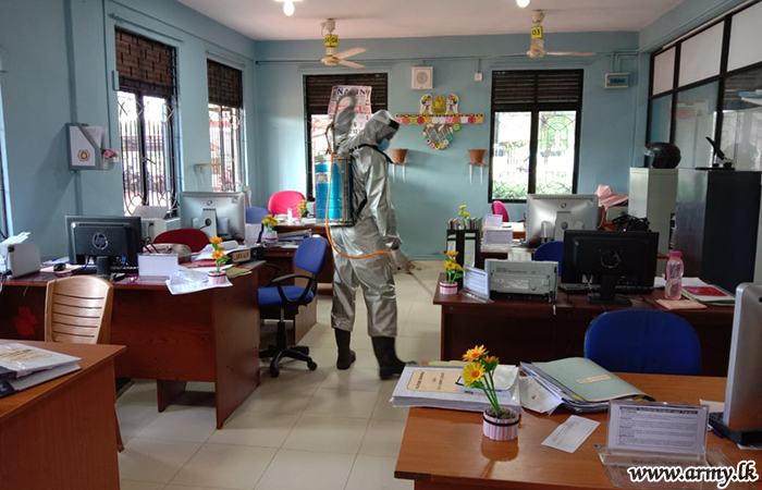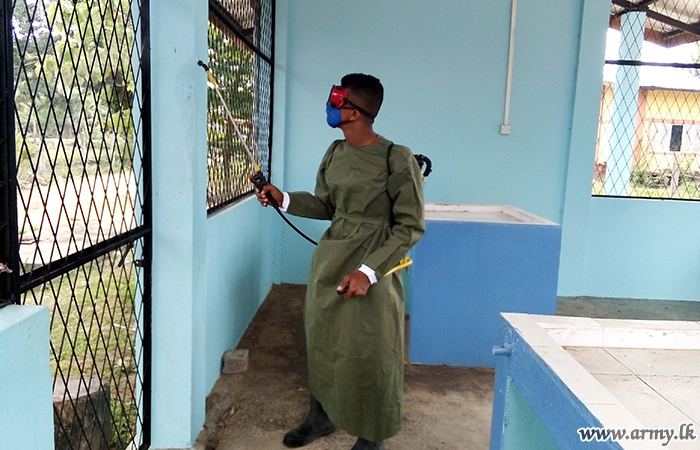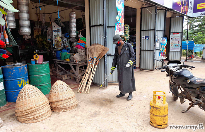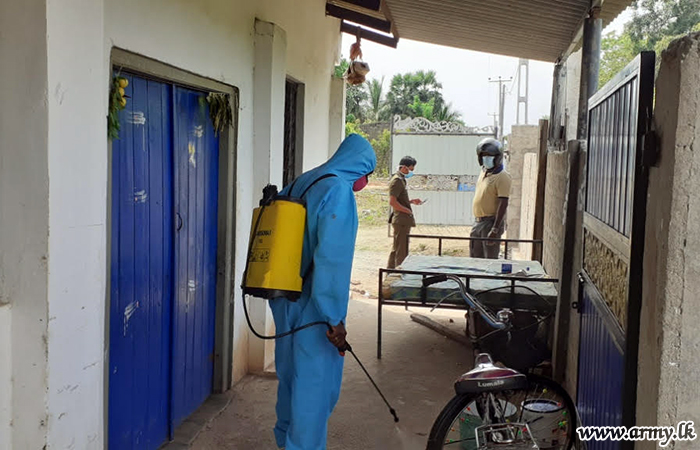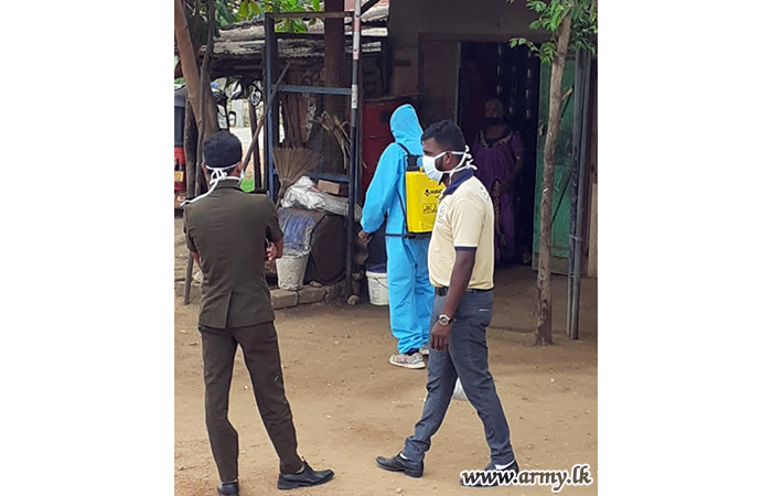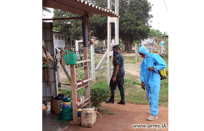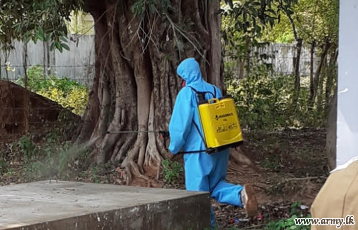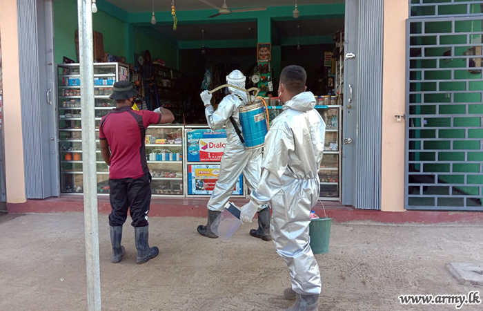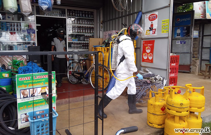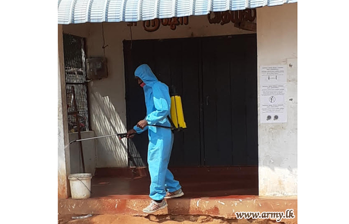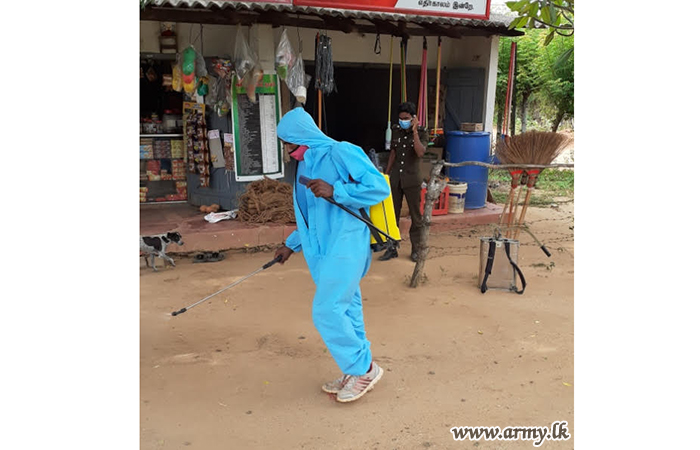 Troops of the 641 Brigade, 643 Brigade, 14 Sri Lanka Sinha Regiment and 13 Sri Lanka National Guard carried out the disinfection project with the support of members of the Public Health Inspectors of respective areas.