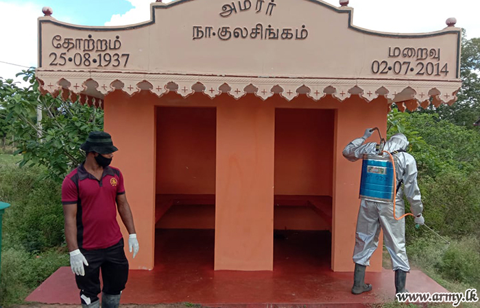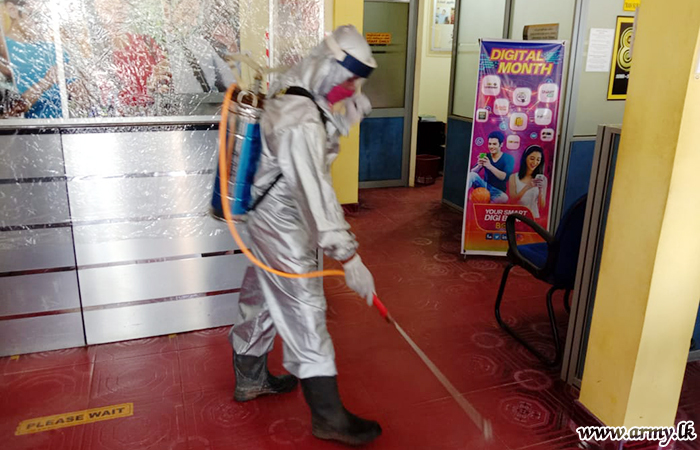 Mullattivu-based 64 Division troops of the Security Force Headquarters - Mullaittivu (SFHQ-MLT) on the directions of Major General Jagath Rathnayake, Commander, Security Forces - MLT and Major General Ajith Pallawela, General Officer Commanding, 64 Division carried out a disinfection and sterilization campaign in and around public places in Mullaitivu in order to mitigate risks of contamination during the spread of COVID - 19 threat.
