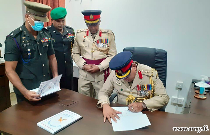 Brigadier Mohan Rathnayake of Gajaba Regiment assumed duties as the Director of the Directorate of Sports at Panagoda on Thursday (5). The newly-appointed Director left his signature for an official document to symbolize the acceptance of the new office after brief religious observances.