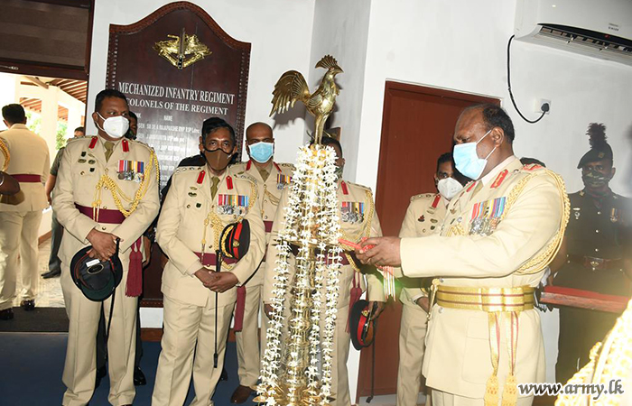 After a formal Guard Turnout at the entrance, the newly-appointed Colonel of the Regiment was received by Brigadier Sujith Balachandra, Chief Executive Officer at Nelum Pokuna Theatre along with Brigadier Janaka Priyadarshana, Commander, Mechanized Infantry Brigade, Brigadier Kumara Wanasinghe, Centre Commandant, Mechanized Infantry Regiment.