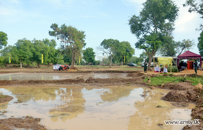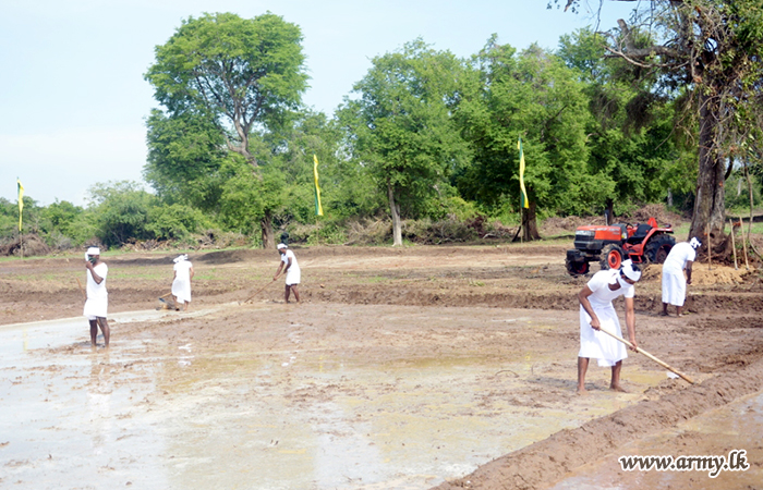 The marshy fields, owned by the Seruwawila Raja Maha Viharaya which had been left unattended were at first dug, waterways made and soil bed prepared before those troops on the directions of the General Officer Commanding (GOC) of the 22 Division, Major General Channa Weerasuriya and under the supervision of the Commander 222 Brigade, Colonel Wiraj Wimalasena, organized the paddy sowing ceremony inside the 10-acre big paddy field patch at the request of the temple's incumbent.