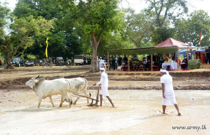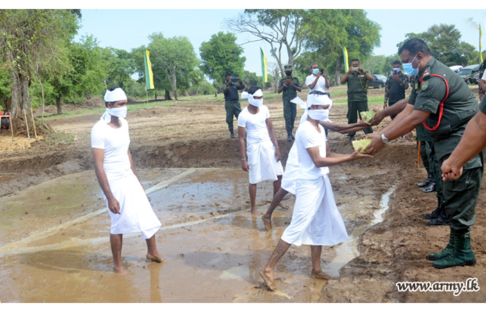 The project coincides with the Army Chief's 'Thuru Mithuru - Nawa Ratak' programme in progress at all levels and is carried out as one of the 'Nation-building' tasks of the 22 VIR Battalion, commanded by Lieutenant Colonel S. Ramanayake. Ancient religious observances, rites and rituals were performed early in the morning before sowing got underway in the presence of the Chief Incumbent of Seruwawila Temple and a gathering of state officials and villagers in the area.