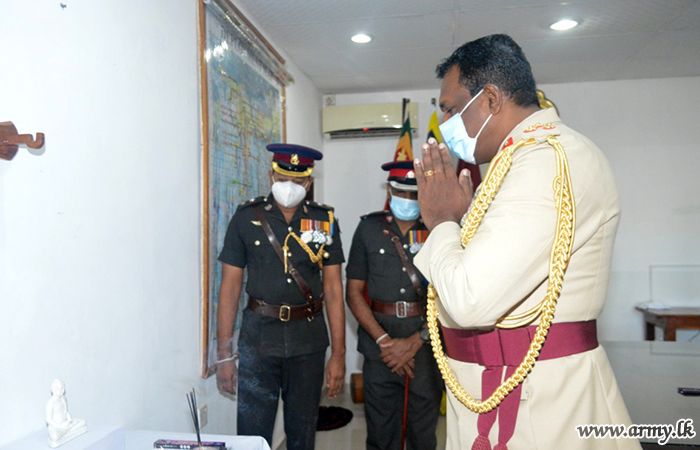 The newly-appointed Commander of the 573 Brigade of the 57 Division of the Security Force HQ-Kilinochchi was warmly welcomed by Staff Officers and honoured in a Guard Turnout, presented by the troops of the 3 Gajaba Regiment. Afterwards, Brigadier Manoj Madurapperuma placed his signature in the first official document to mark his assumption of duties, amidst religious observances in the presence of Senior Officers.