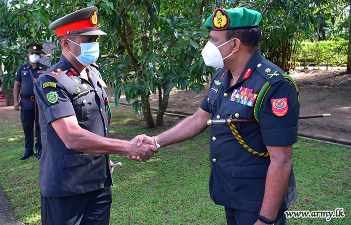 During his visit to the 11 Division HQ in Pallekele, Major General Sarada Samarakoon, General Officer Commanding (GOC), 11 Division welcomed him at the entrance to the Divisional headquarters and briefed him afterwards on the role and tasks of the Division in their area of responsibility.