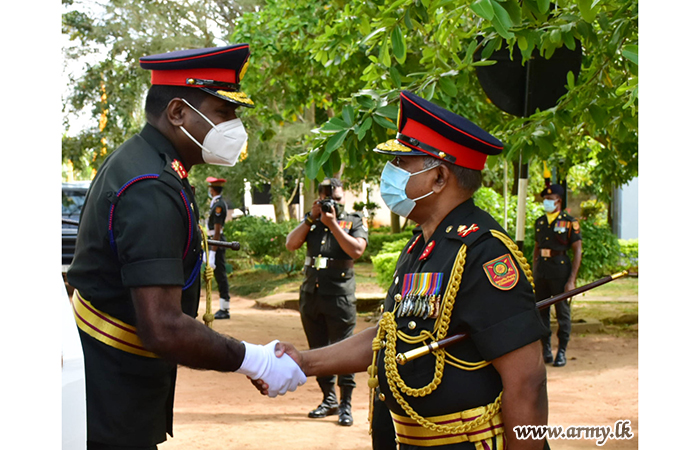 On arrival at the 65 Division HQ, Commander Security Forces Kilinochchi was received by the General Officer Commanding, 65 Division, Major General Tikiri Dissanayake, and was honoured in a Guard Turnout.