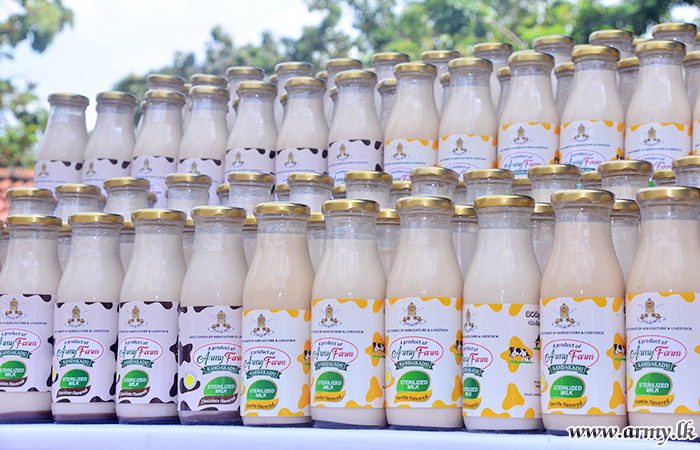 The Army's Directorate of Agriculture and Livestock making great strides in the nutritional sector of all soldiers created history by symbolizing its maiden fresh milk production process at Kandakadu and delivering the first consignment of 1000 fresh milk bottles for distribution among soldiers through the Army Seva Vanitha Unit welfare shops.