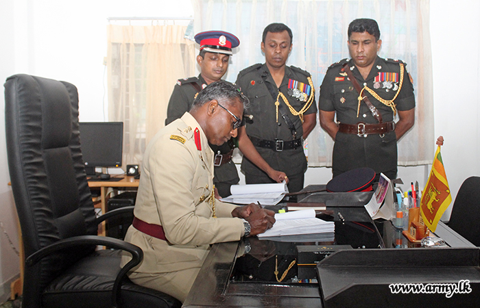 The newly-appointed Commander of the 571 Brigade of the 57 Division was warmly welcomed by Staff Officers and honoured in a Guard Turnout, presented by 7 Sri Lanka Light Infantry troops. Afterwards, Colonel Dammika Welagedara placed his signature in an official document to mark his assumption of duties in the presence of a few Senior Officers.