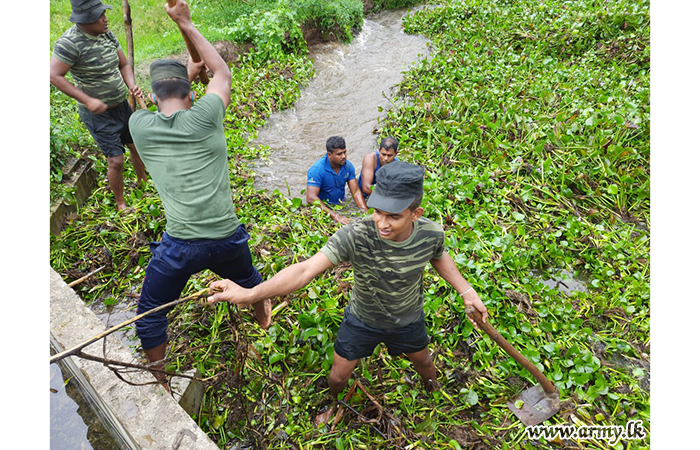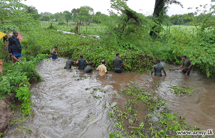 The Divisional Secretariat sought the support of the troops for the Nabadagasdigiliya tank clean-up after the troops averted a major breach in the Andiyapuliyankulam tank bund after heavy rains made the tank to overflow its bunds after piercing its bund. By laying sandbags, together with civilians, the 2 Mechanized Infantry Regiment troops prevented its breach.