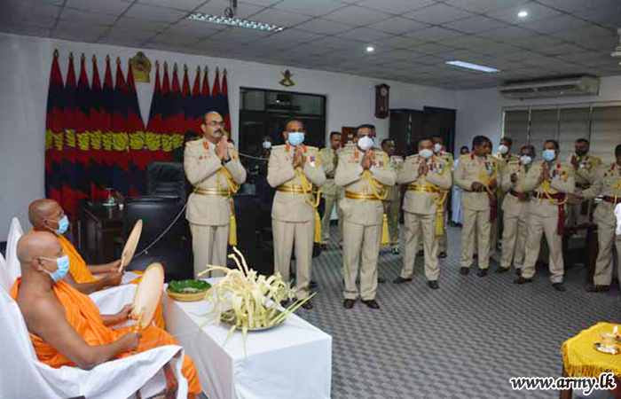 A few minutes later, a ceremonial military parade, honoured the newly-appointed Colonel Commandant where he received the salute from the special dais. Then in the office, Major General Kumara Peiris placed his signature for an official document to symbolize the acceptance of his new office, amidst chanting of 'Seth Pirith' by members of the Maha Sanga. The day’s ceremony reached the culmination with his formal address to Officers at the Lieutenant General N.K.B Angammana Memorial auditorium and refreshments with All Ranks at the Utility building at the Regimental Headquarters. |