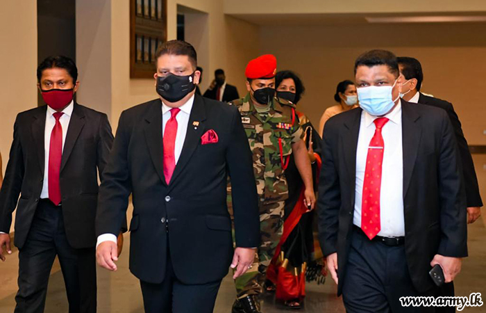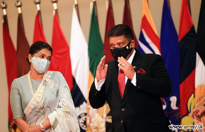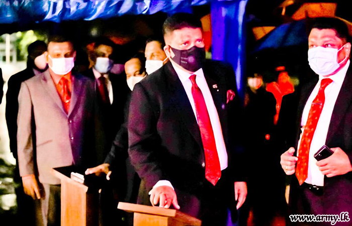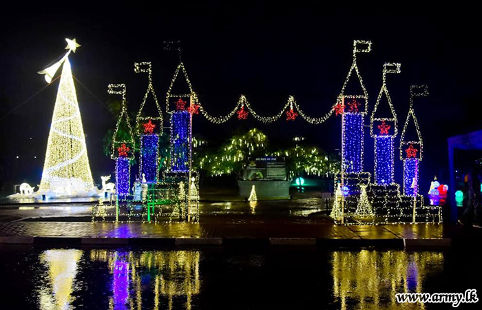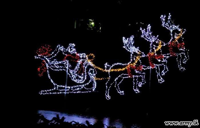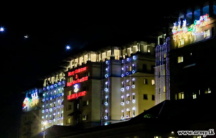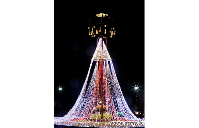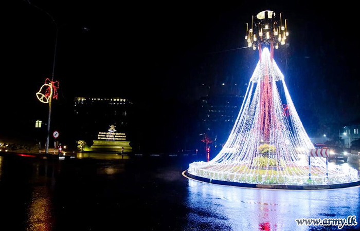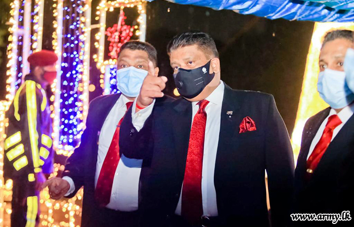 The event's Chief Guest, Lieutenant General Shavendra Silva at the invitation of the Major General Wasantha Madola, Commander, Logistics Command Headquarters, together with his spouse, Chief of Staff and a few Senior Officers as dusk fell switched on the illuminations along the road that leads to the Army HQ and the Army HQ complex as part of the festive beautification, a spectacle that cannot be seen elsewhere in Colombo due to COVID-19 transmission threat.