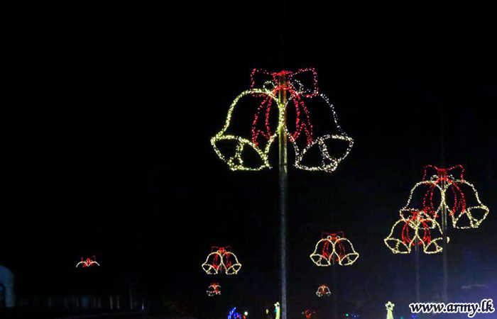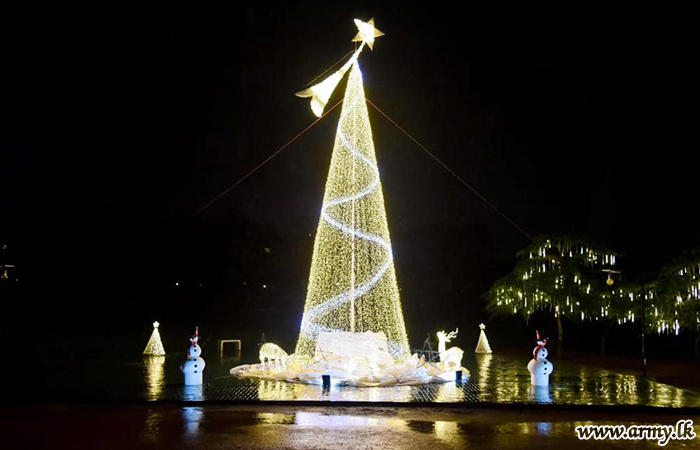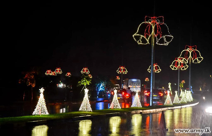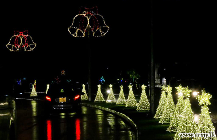 Prior to the customary X'mas service at the Army HQ got underway, Lieutenant General Shavendra Silva, Chief of Defence Staff and Commander of the Army along with his spouse, Mrs Sujeewa Nelson, President Army Seva Vanitha Unit Tuesday (23) evening arrived at the Central Environment Authority junction turn, switched on Christmas illuminations and unveiled decorations along the road passage to the Army HQ which has been developed and beautified by the Army under the 'Thuru Mithuru Nawa Ratak' project of the Commander of the Army.
