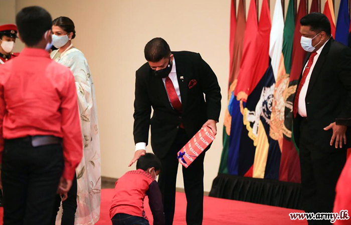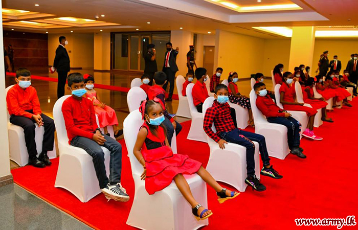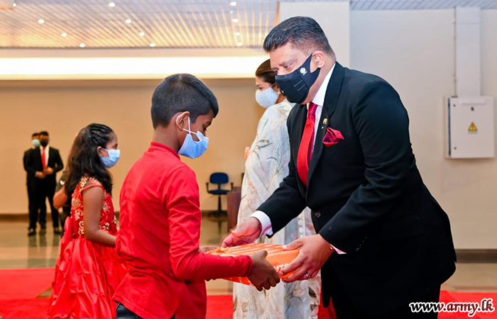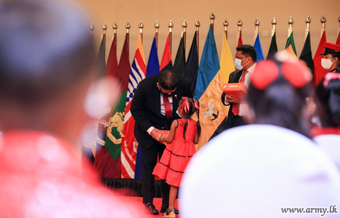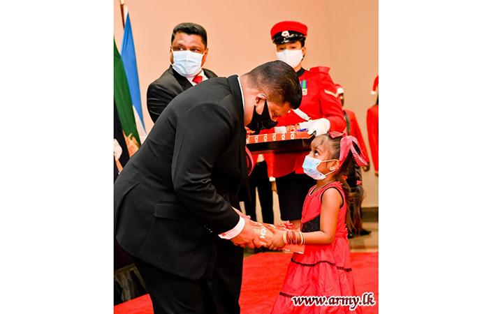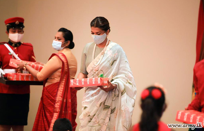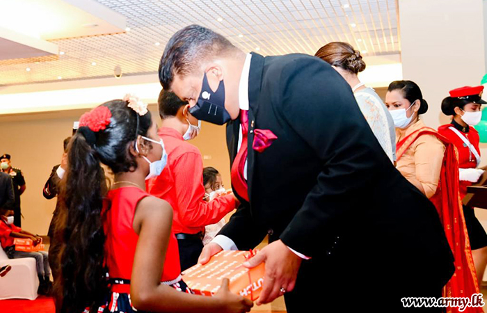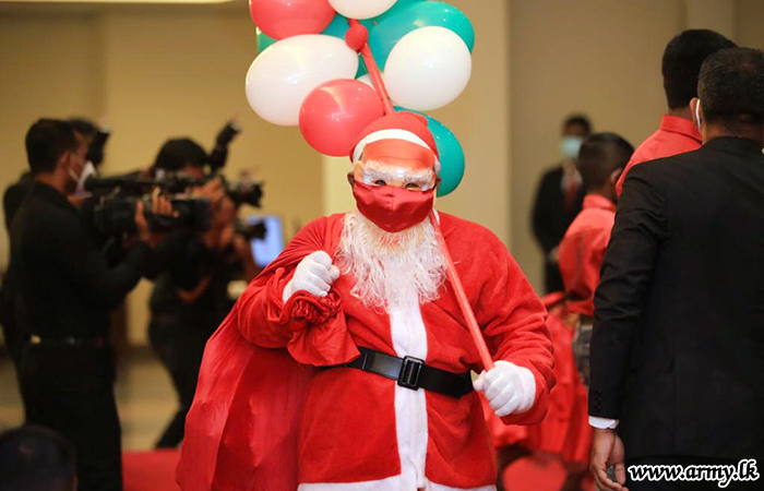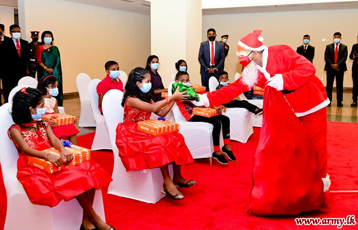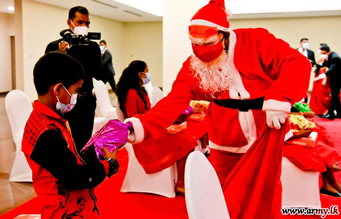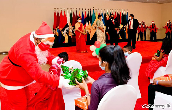 A few minutes later, both the Commander of the Army and his spouse joined distribution of gift parcels and incentives to a representative group of children of Army families after inviting them to the Army HQ as one more welfare feature, highlighted in the just released 'Army Way Forward Strategy -2020-2025. Lieutenant General Shavendra Silva and Mrs Sujeewa Nelson distributed those incentives, together with the colourfully-dressed Santa Clause, an eye-catching customary feature during the Christmas season.