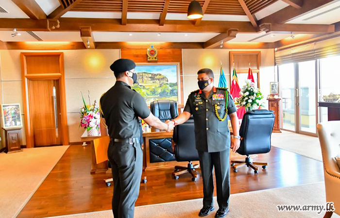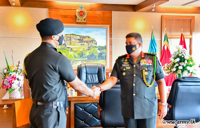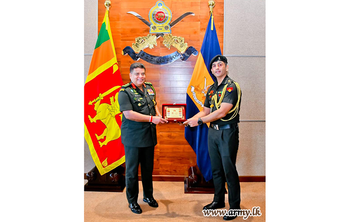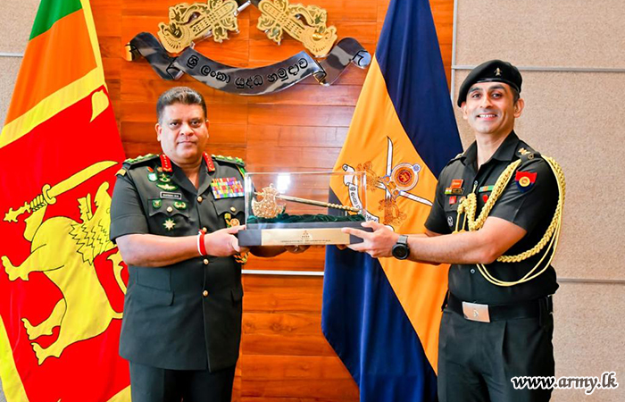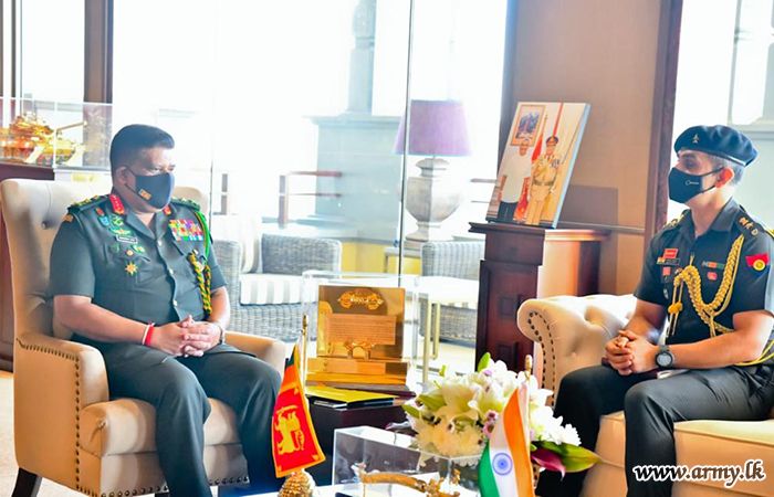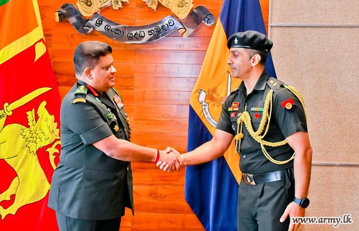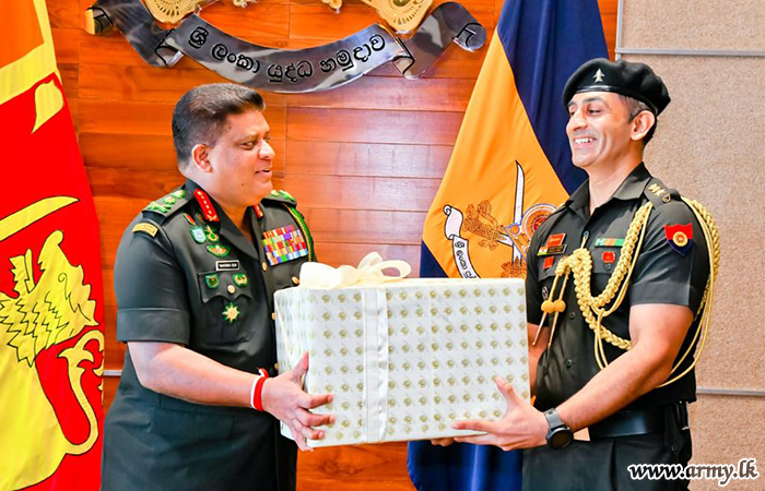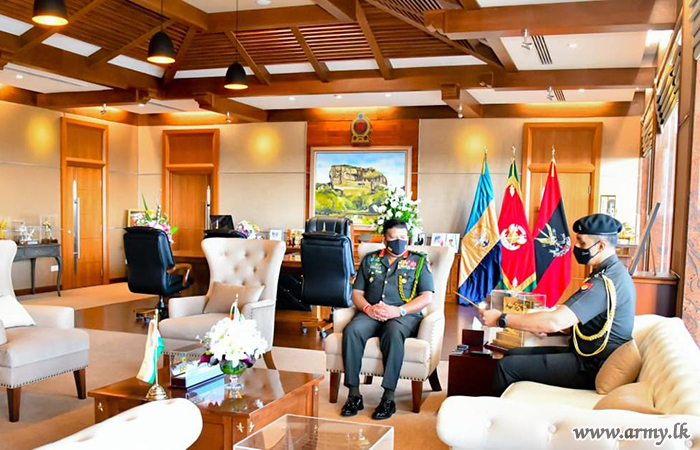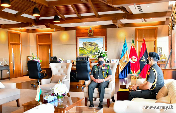 The Assistant Defence Attache at the High Commission of India in Sri Lanka, Lieutenant Colonel Puneet Sushil bringing seasonal compliments paid a courtesy call on the Chief of Defence Staff, Commander of the Army and Head of the National Operations Centre for Prevention of COVID 19 Outbreak, General Shavendra Silva on Wednesday (6) at the Army Headquarters.