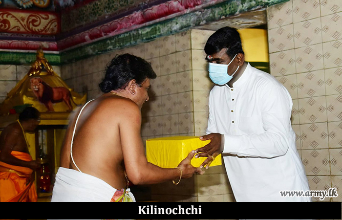 Security Force Kilinochchi troops organized religious rituals at Kilinochchi Kandaswamy Kovil to celebrate Thaipongal Day on Thursday (14) on the guidelines given by Major General Sampath Kotuwegoda, Commander, Security Forces Kilinochchi in collaboration with the support given by Major General Sujeewa Senarathyapa, General Officer Commanding 57 Division.