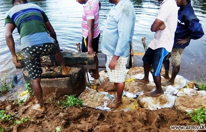 A water leak occurred on the Kombuweththikulam tank bund in Palappanai Grama Niladahari Divison in Mullaittivu District due to heavy rains was repaired using sand bags by 10 Sri Lanka Light Infantry (SLLI) troops with the support of villagers on 13 January 2021.