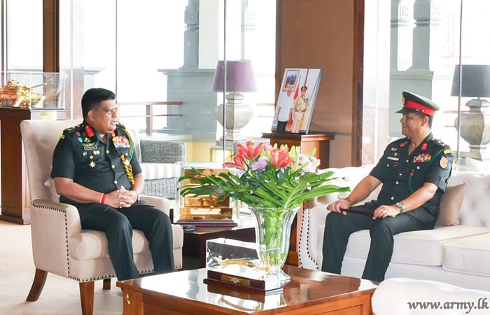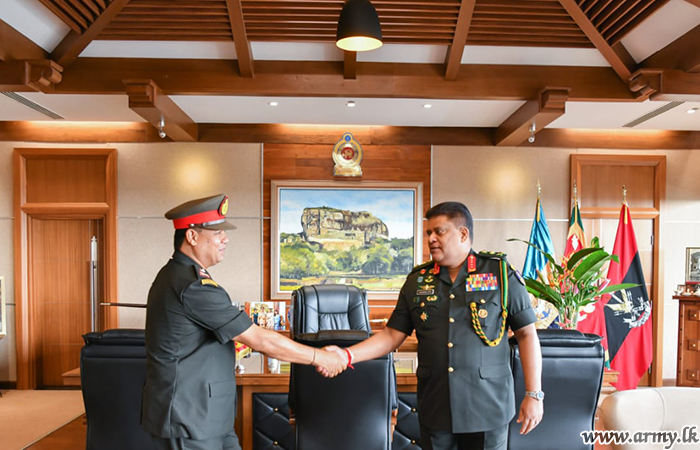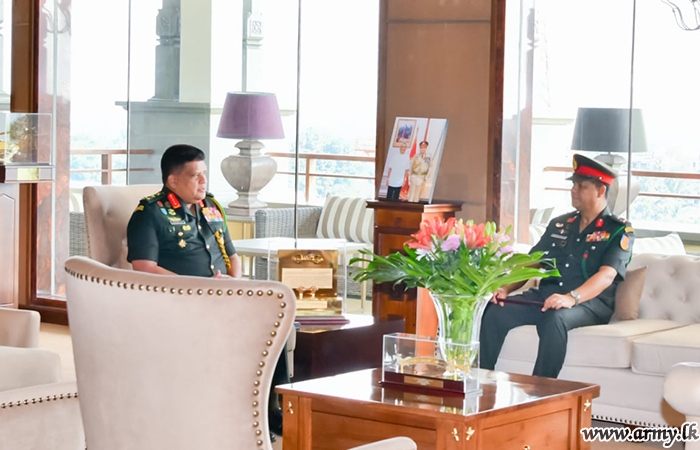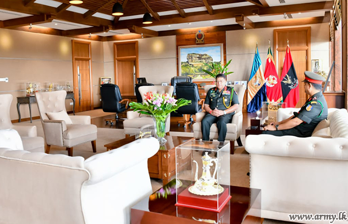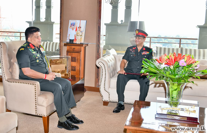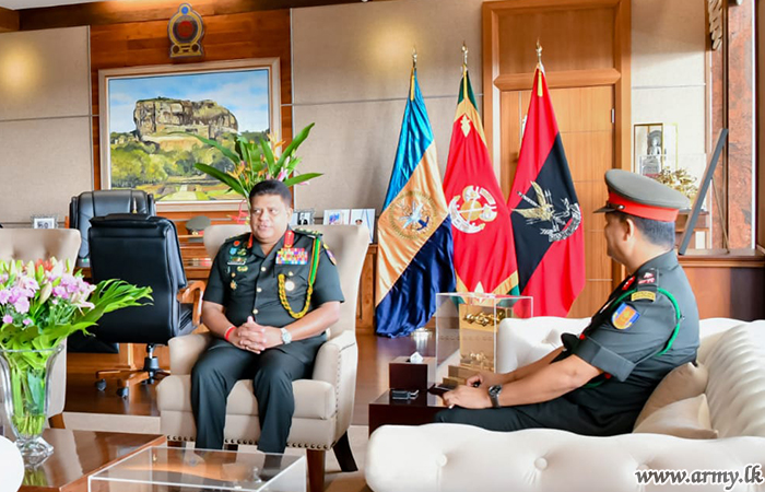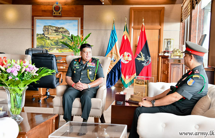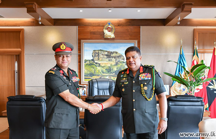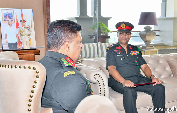 General Shavendra Silva, Chief of Defence Staff and Commander of the Army this afternoon (18) extended his best wishes to the new Chief of Staff, Major General Senarath Bandara when the latter paid his first courtesy call on the incumbent Commander of the Army at his office.