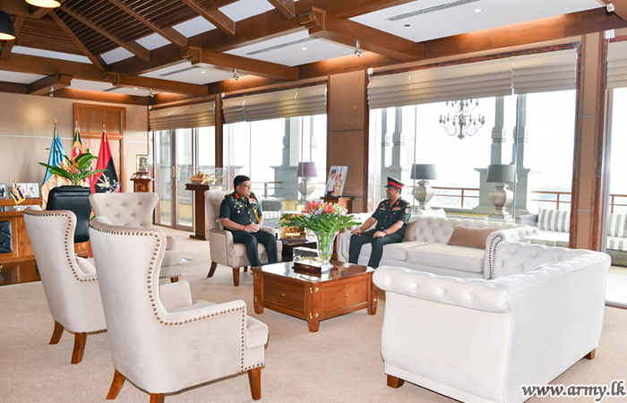 During the brief interaction, General Shavendra Silva congratulating the Senior Officer on his new office exchanged a few words with him and wanted him to seriously address and prioritize concerns in regard to accommodation, welfare, living standards of soldiers at the Headquarters and evaluate the progress on a weekly basis after appointing necessary administrative boards as deemed necessary and expedite those requirements.