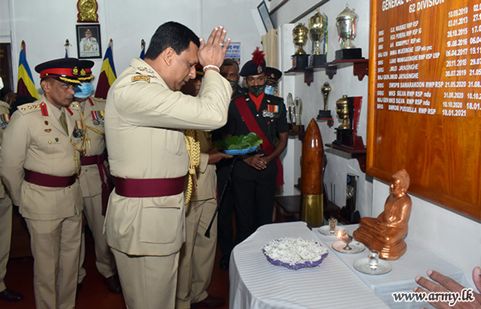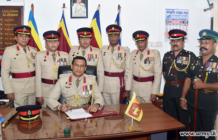The newly-appointed General Officer Commanding, 62 Division was warmly welcomed by all Brigade Commanders and Division's Staff Officers and honoured in the Guard Turnout presented by troops of 9th Battalion Gajaba Regiment. Afterwards, he was invited to plant a sapling as a gesture of memory before he placed his signature for an official document to mark his assumption of duties, amidst chanting of 'Seth Pirith' in the presence of senior officers. Later, he addressed all rankers of the Division and spoke out his mind followed by an all rank lunch. Staff Officers and Other Rankers were present during the address.