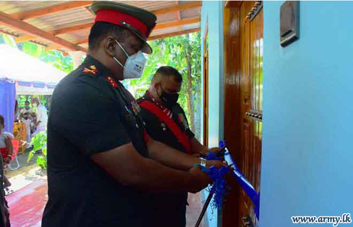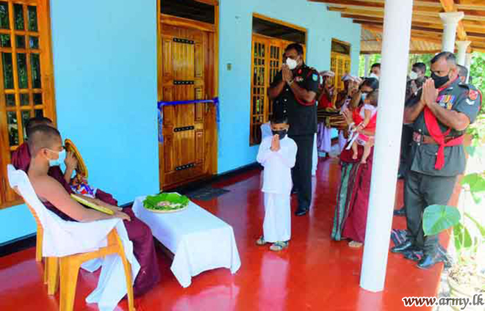 One more new house, built for another deserving SLLI soldier at a cost of about Rs 1.4 m in Nawagaththegama area was warmed and formally vested in the beneficiary amid religious observances, rites and rituals on Tuesday (19). The three-roomed house, constructed by 17 SLLI troops was opened by Major General Channa Weerasooriya as the Chief Guest to mark the opening.