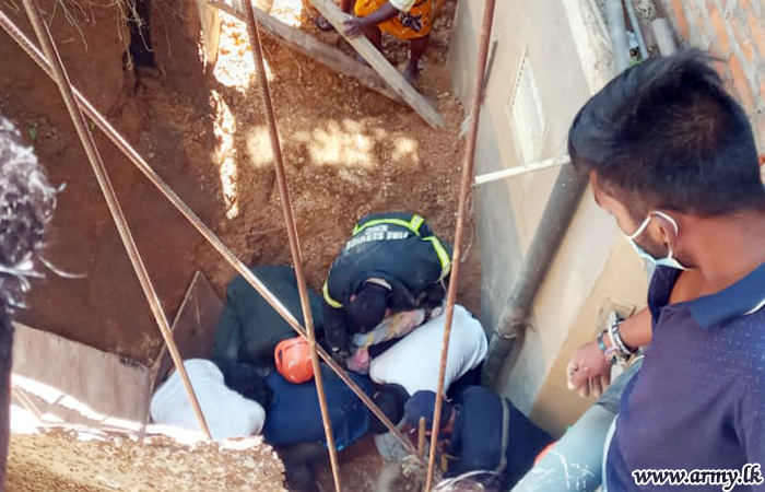 2 (V) Sri Lanka Sinha Regiment (SLSR) troops of the 11 Division of the Security Force Headquarters - Central (SFHQ-C) promptly responded to an SOS call received from the Kundasale Fire Brigade for assistance on Tuesday (26) and hurried to rescue a couple of civilians, said to have been buried beneath a mound of earth in the general area of Nagasthenna, Kandy.