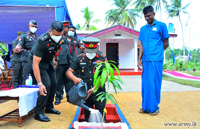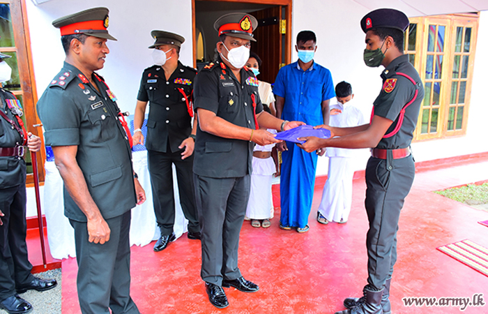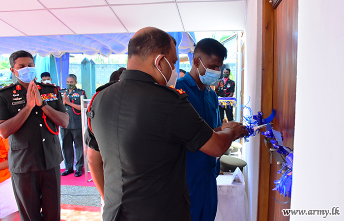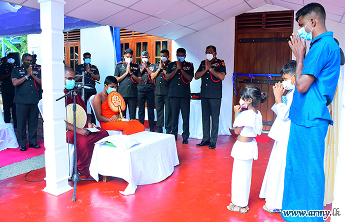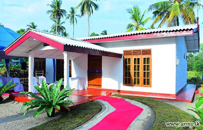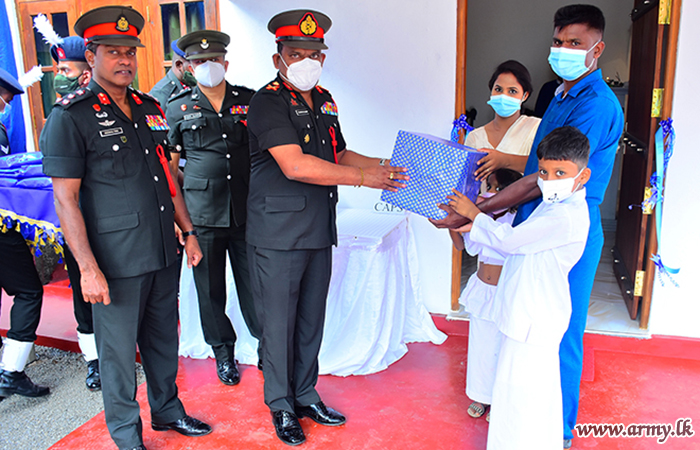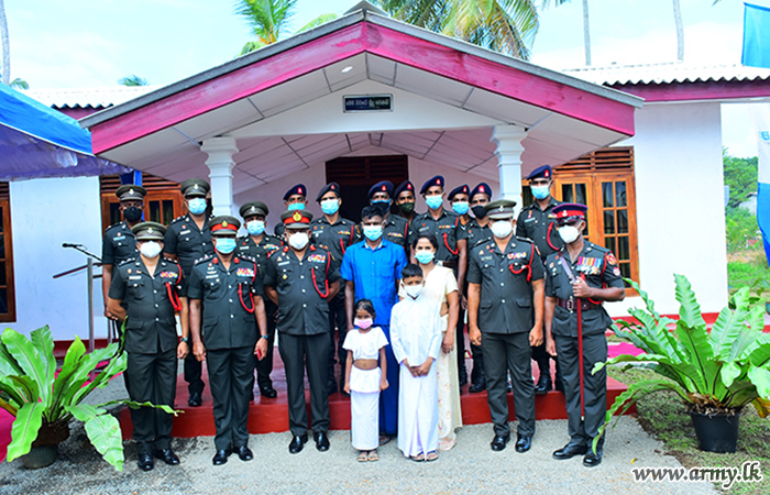 The new home, built by SLLI troops of the HQ Battalion at Nittambuwa cost Rs 1.5 million and the beneficiary, a senior Non-Commissioned Officer (NCO) sustained permanent injuries during the fight against LTTE terrorism. A brief ceremony for the house-warming followed rites and rituals such as milk-pot boiling, religious observances, etc after the day's Chief Guest, Major General Wasantha Abrew cut a ribbon and opened it with the beneficiary and his family members.