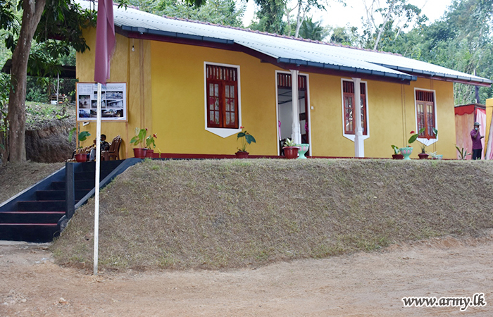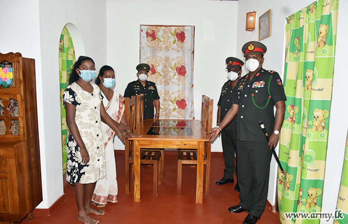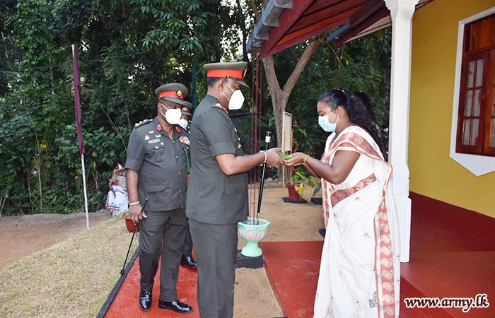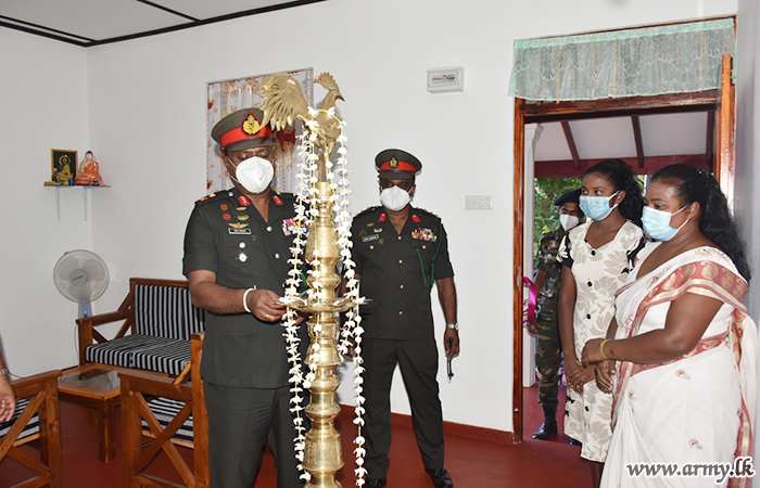 To be in line with the conceptual guidance, initiated by the Chief of Defence Staff and Commander of the Army to build as many houses as possible for families of fallen War Heroes and differently able soldiers, a new house, erected under the 'Housing Project Phase V' was ceremonially vested in the family members of Late Private S. K. Priyantha (3 MIR) in Beliatta area.