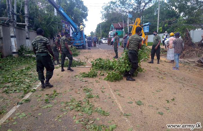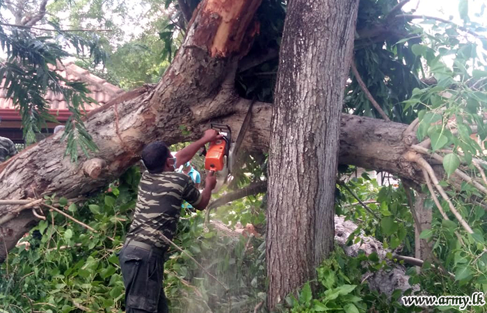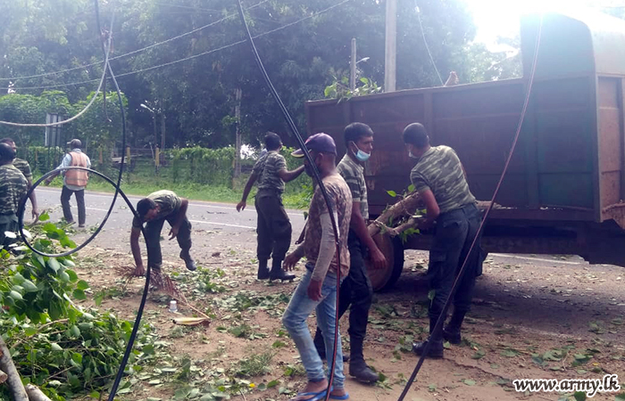 On the guidelines given by the GOC of the 12 Division, those SLNG troops under the supervision of the 122 Brigade Commander and the Commanding Officer cleared the tree by choppping it into pieces within the shortest possible time. Traffic movement was restored with the assistance of the Police. |