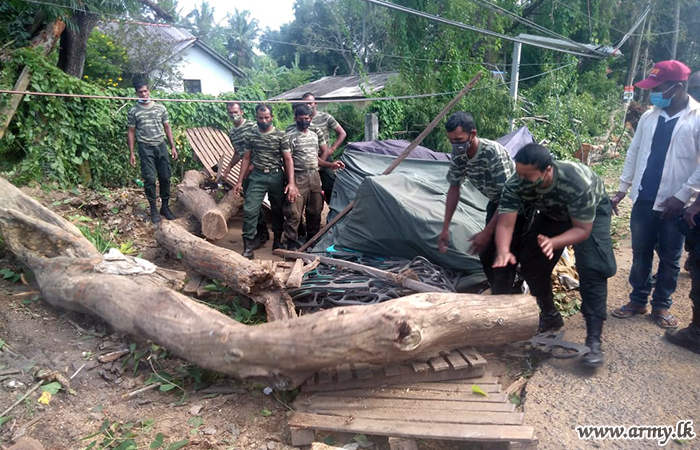 3 Sri Lanka National Guard (SLNG) troops of the 122 Brigade under the 12 Division located in Tissamaharamaya on Thursday (11) immediately cleared a huge fallen tree that has blocked the traffic along Tissa-Kataragama main road, near the Eco Safari Hotel in Tissamaharamaya.