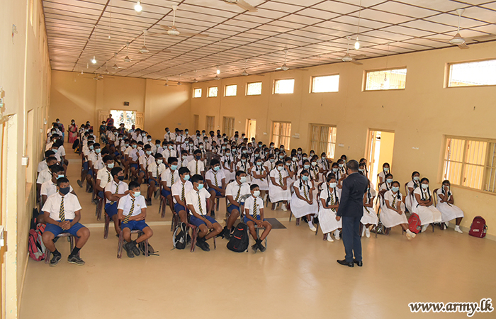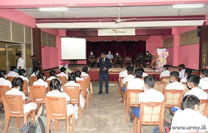 With the blessings of the Commander Security Forces Kilinochchi, Major General Sampath Kotuwegoda and guidelines given by the Commander Forward Maintenance Area Kilinochichi Major General Piyal Nanayakkarawasam, a counselling workshop on 'Management of Exam Stress' was conducted for 350 students in two schools who are scheduled to sit for the G.C.E (O/L) examination in the year 2021.
