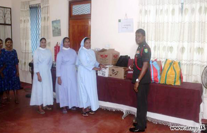 The sponsor of the consignment of relief supplies, Ven Narampanawe Ananda Nayake Thera, Deputy Registrar of the Asgiriya Chapter and Parivenadhipathi of the Asgiriya Maha Pirivena under this relief project gave away most essentials to 10 Buddhist temples, utensils, dry rations and household items to 97 poor families in the area, educational accessories to 181 Sunday school students and clothes, dry rations, furniture and learning aids to the inmates at Neriyakulam Salvatorian Children's Home.
