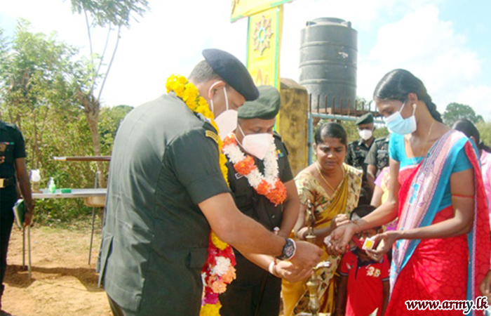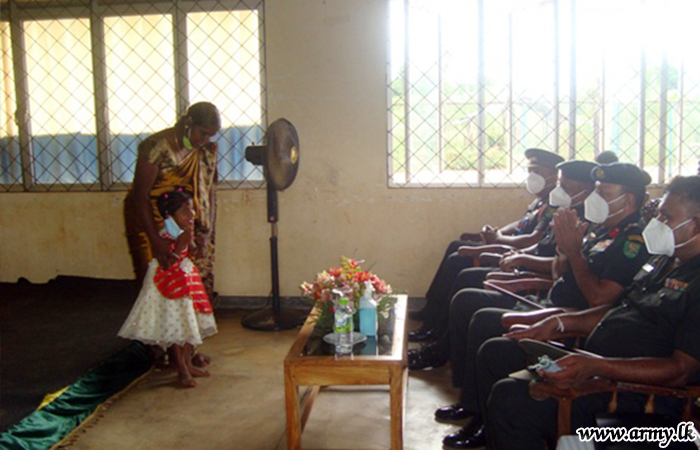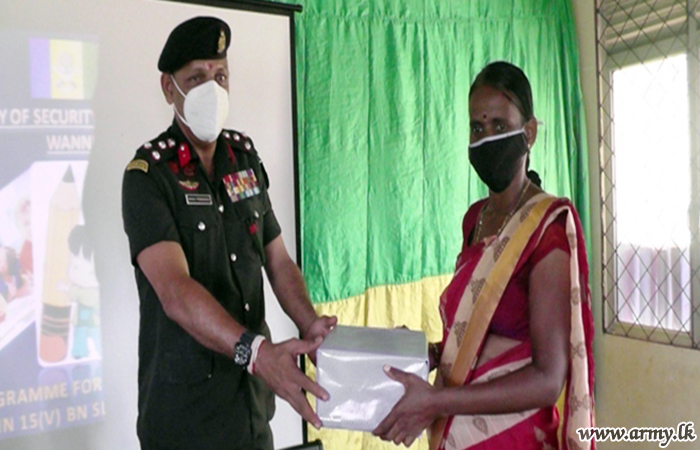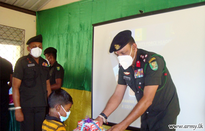 Troops of the Security Force HQ- Wanni on the directions of Major General Hemantha Bandara, Commander, Security Forces-Wanni and under the guidance of the General Officer Commander 56 Division Major General Nandana Dunuwila, distribute a stock of exercise and reading books and preschool accessories to 30 preschool kids at the Prasankulam Preschool on Monday (08) to coincide with the 23rd anniversary of the Security Force Headquarters-Wanni.
