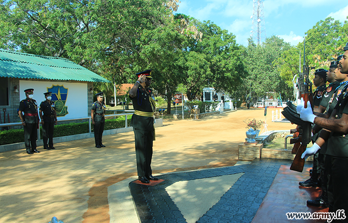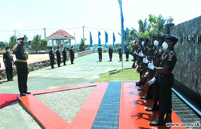 A Guard Turnout at the entrance greeted him before he was welcomed by the Commanding Officer, 3 SLSC, Lieutenant Colonel H.A.D.W Hettiarachchi, followed by offer of floral tributes to the memory of War Heroes at the monument.