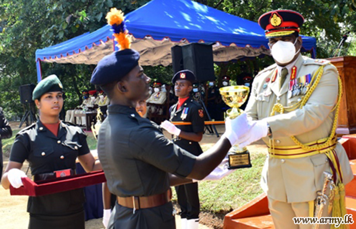 Private H.P.T.M Sampath received the trophy from the Chief Guest as the Best Recruit having achieved the highest aggregate marks for all theoretical and practical disciplines during the training course.