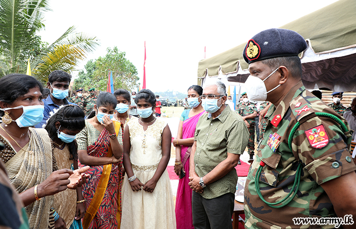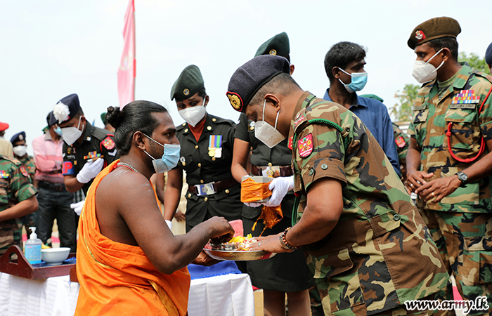 During a brief ceremony organized by 513 Brigade troops on Friday (19), Commander Security Forces - Jaffna Major General Priyantha Perera laid the foundation stone for construction of a new house for Mrs. R. Amudapriya and her family in Sangarathai, Jaffna amidst religious customs after learning about her plight with children.