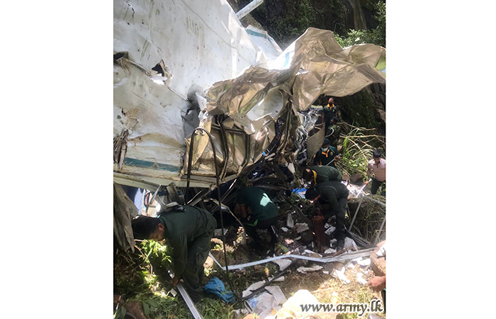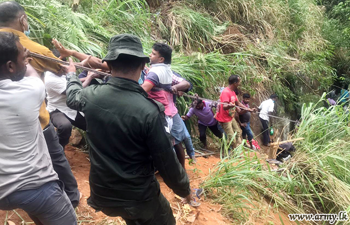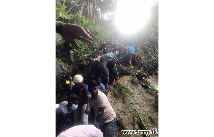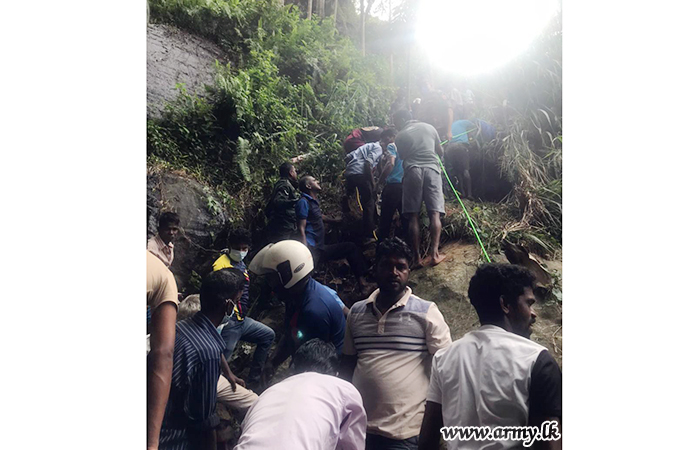 Army troops of the 112 Brigade of the 11 Division who rushed to the 13th Mile Post in Passara area where a passenger bus has skidded off and fell into a precipice of more than 200 ft, near Passara along Badulla- Bibile road, are currently engaged in rescue operations, together with others as of this morning (20).