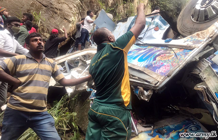 The bus with full capacity has left Badulla around 7.00 am and reached the location of the accident by about 7.30 am when it lost control and fell into the precipice, killing 14 and injuring more than 45 passengers. At the time this report was filed, those troops on the instructions of Brigadier Anura Dissanayaka, 112 Brigade Commander were busy removing remains of passengers and rescuing those trapped under the badly-affected bus. The Army team included medical assistants, too.
