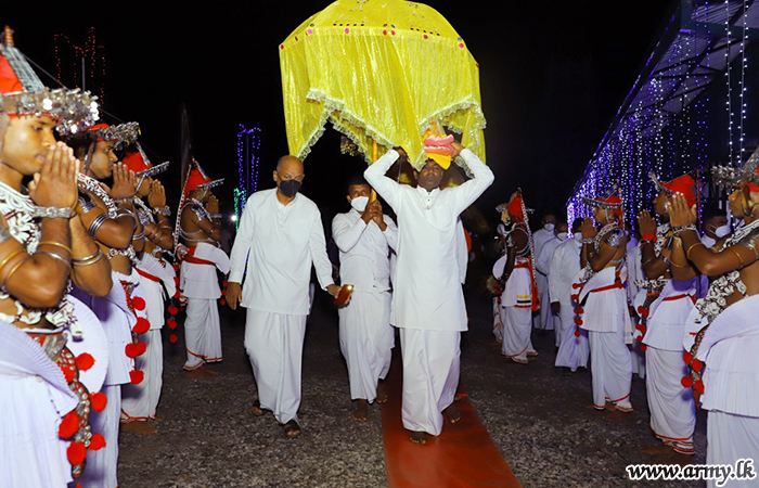 An all-night 'Pirith' chanting ceremony got to a start on Tuesday (30) evening after monks were ushered to the chanting octagon in a colourful procession, comprised of SLAVF artistes. After the casket of relics was respectfully placed by the SLAVF Commandant, an oration (Anushasana) delivered by a member of the Maha Sangha underlined the importance of the occasion.