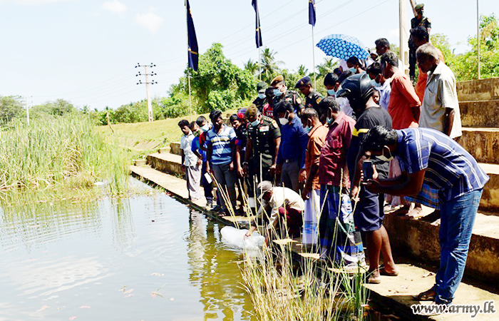 Troops of the 571 Brigade considering possibilities for income generating and nutrition factors released 20,000 fish fingerlings to the Dryarukulam Tank in Kilinochchi on Monday (29).