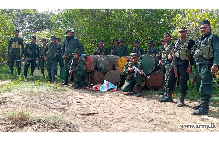 Alert Kilinochchi troops coordinating with respective Policemen, officials of Department of Wildlife Conservation, Department of Forest Conservation, Geological Survey and Mines Bureau, Excise Department and other relevant authorities within a period of almost one month (March 2021- April 2021) have carried out raids against production of moonshine, sand mining, illegal logging, smuggling of cannabis and narcotics, transport of illegally felled satinwood, palu and other valuable trees and other anti-social activities.