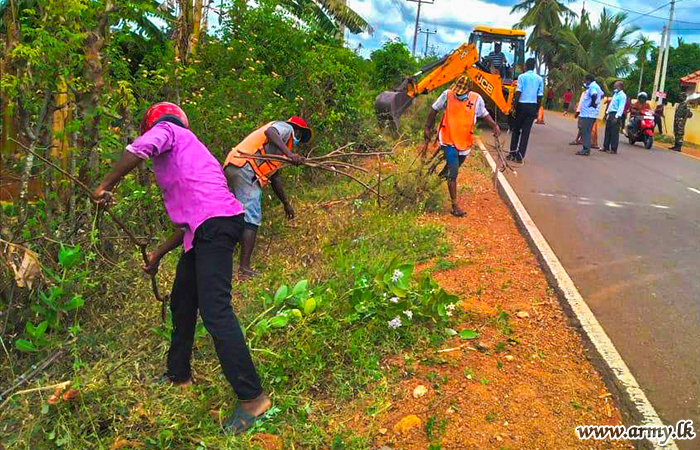 Further, this community-based project was launched with the support of the Commander 521 Brigade, Colonel Mahen Salwathura. During this programme, the road patch of 8.5 km along Achchuveli - Palaly road was cleaned by 11 Battalion of Vijayabahu Infantry Regiment troops.