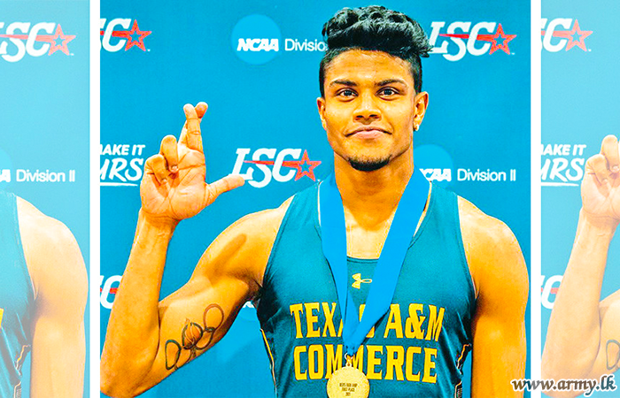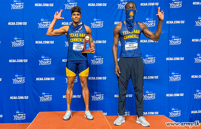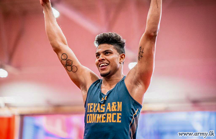 Private Ushan Thiwanka Perera representing Texas A & M University-Commerce set the record with a jump of 2.30 meters to place first in the Men’s High Jump event among outdoor championships.