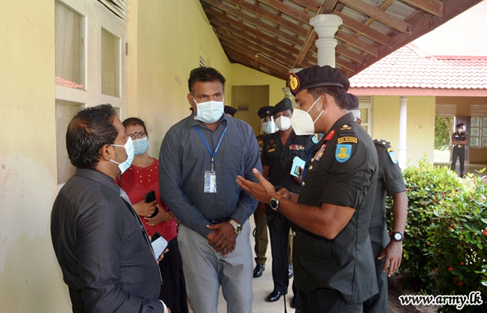 On Monday (10), District Secretary for Trincomalee, Mr. Saman Dharshana Padikorala, Deputy Regional Director of Health Services for Trincomalee Dr. V Premanath and MOH Kuchchaweli Dr. S Yamuna, General Officer Commanding, 22 Division Major General Samantha Silva, Commander 221 Brigade Brigadier Priyantha Kariyawasam and a few other officials made an observation visit to the improvised ICC and inquired into different facets of the project.