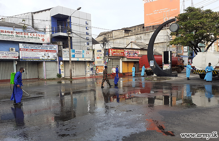 17 Gemunu Watch, 14 Gajaba Regiment and 512 Brigade Troops of the 51 Division on the directions of Major General Priyantha Perera, Commander, Security Forces-Jaffna, together with guidance given by the General Officer Commanding, 51 Division, 512 Brigade Commander and respective Commanding Officers on Thursday (12) carried out a thorough sterilization project in the heart of Jaffna town with the objective of curtailing the speedy transmission of the deadly virus among the general public.