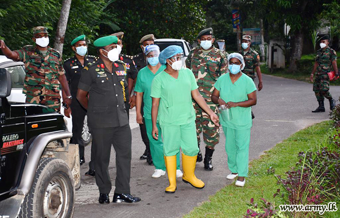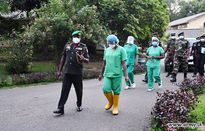 Major General Dammi Hewage, General Officer Commanding, 61 Division, together with 613 Brigade Commander and Commanding Officer 14 (V) Gemunu Watch on Monday (17) visited the Meepe Rural Hopital in Habaraduwa where COVID-19 patients remain warded.
