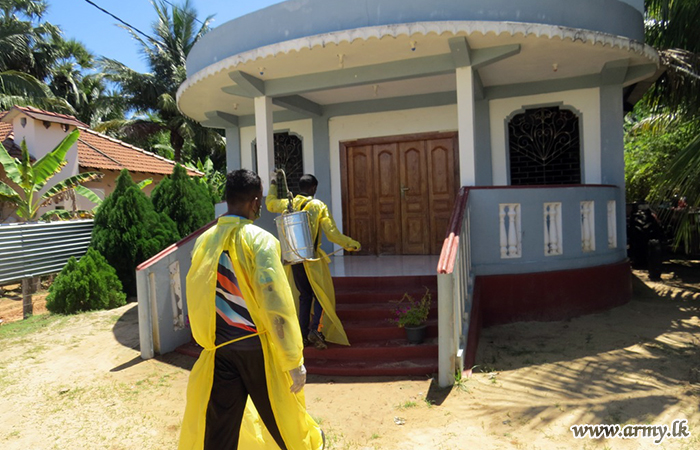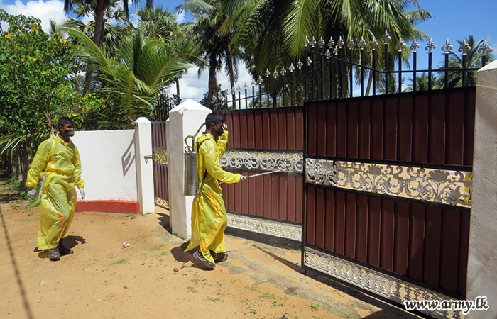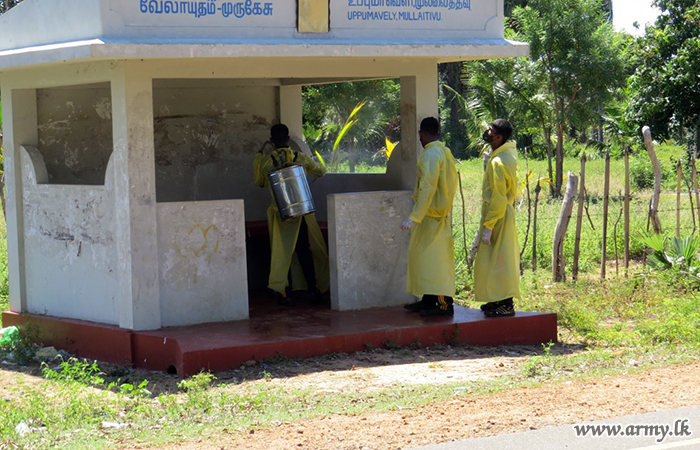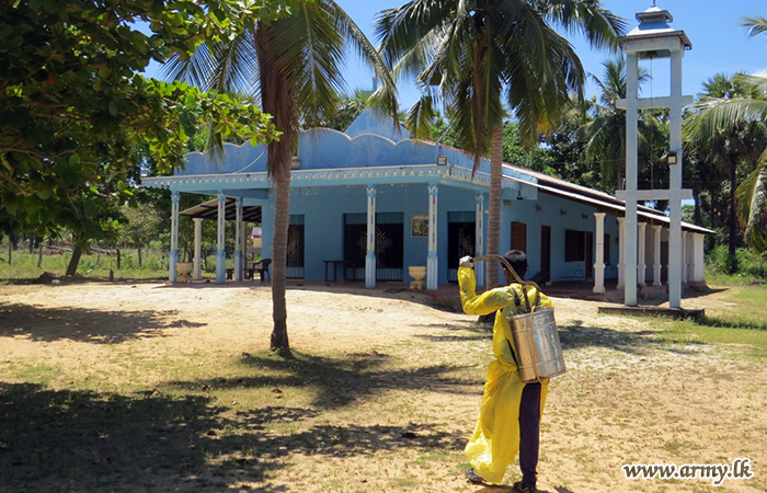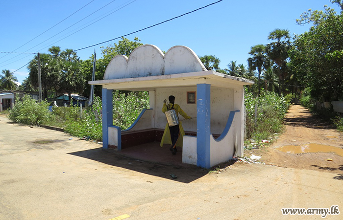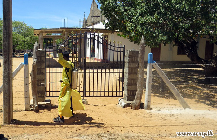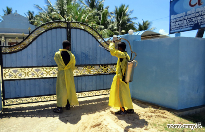 Troops of the 591 Brigade on Thursday (6) disinfected several public places including Annawelamgani Church, Aponso Thalika church, Alampil Saint Anthony's church, Uduppu Thulam Kulendra Jesus Church, Uduppu Kulam Bus stand, Punida Annamalai Church and Silawaththa Bus Stand.