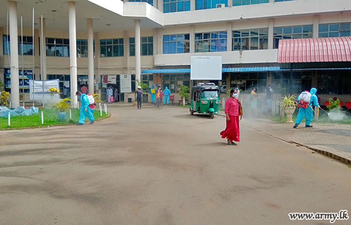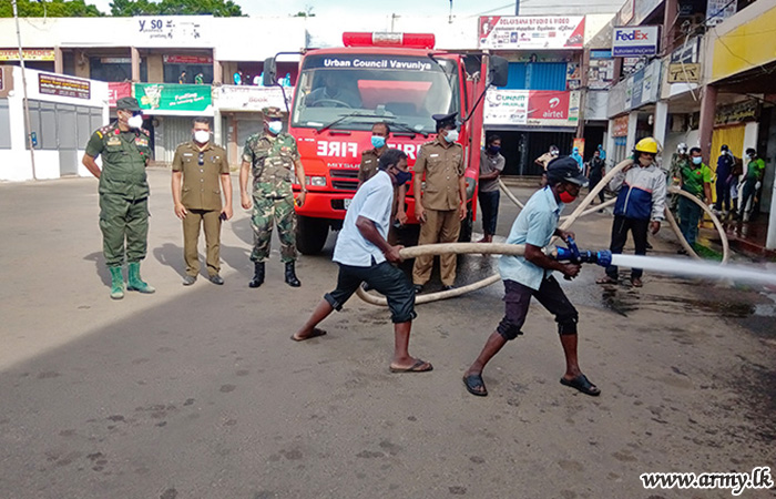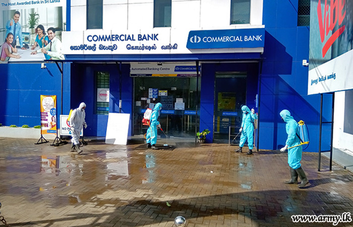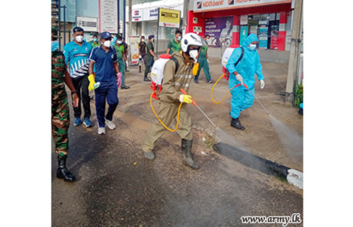 The troops of the 562 Brigade under the supervision of Commander 562 Brigade Brigadier Senaka Premawansa, sterilized public places such as Bus Stands, the Railway Station, Welfare Centers, State and Private Banks, Markets, Hospital and public assembly points in Vavuniya city area. This programme was carried out by 17 Sri Lanka Sinha Regiment with the assistance of Sri Lanka Engineers Troops, Vauniya Police, Public Health Inspectors, and Urban Council members.