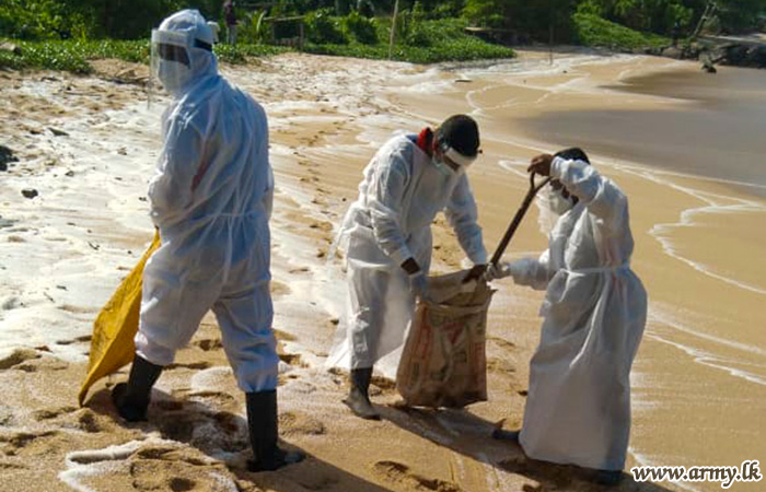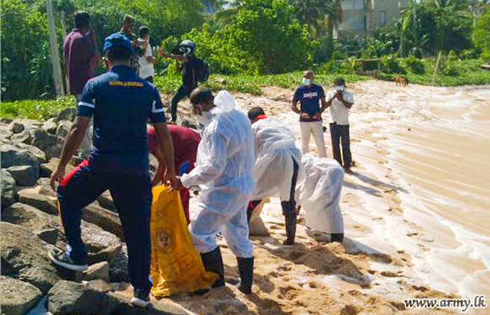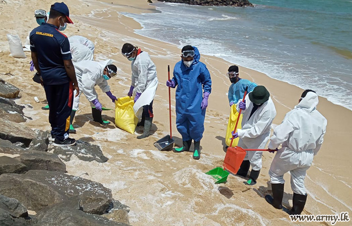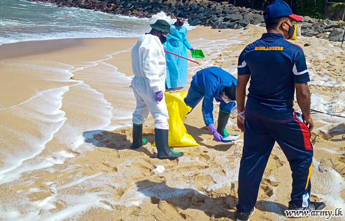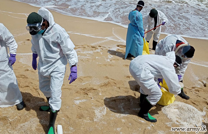Troops of the 3 Gemunu Watch of the 613 Brigade under command to the 61 Division of the Security Force HQ-West during 28-29 May 2021 cleaned Weligama and Mirissa coastal belt areas, affected due to debris of the damaged 'X Press Perl' container ship a few days ago.